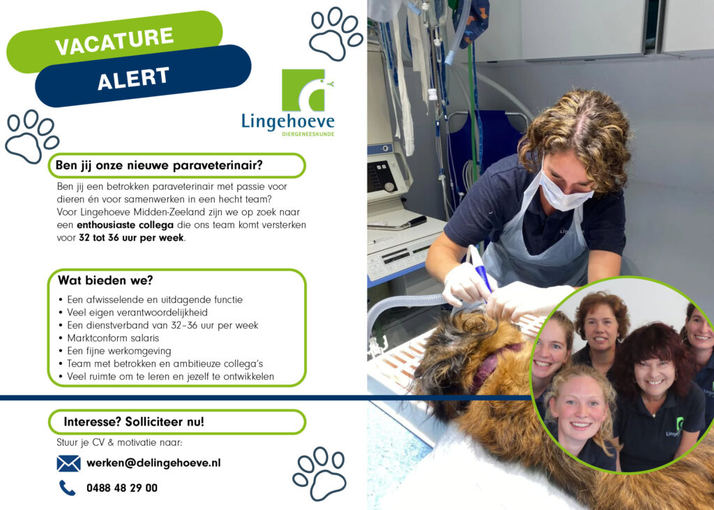 Wil jij werken bij een van de grootste dierenklinieken van Nederland? Reageer dan hier naar een van onze huidige vacatures. Staat er niks voor je bij? Stuur dan een open sollicitatie naar info@lingehoevemiddenzeeland.nl